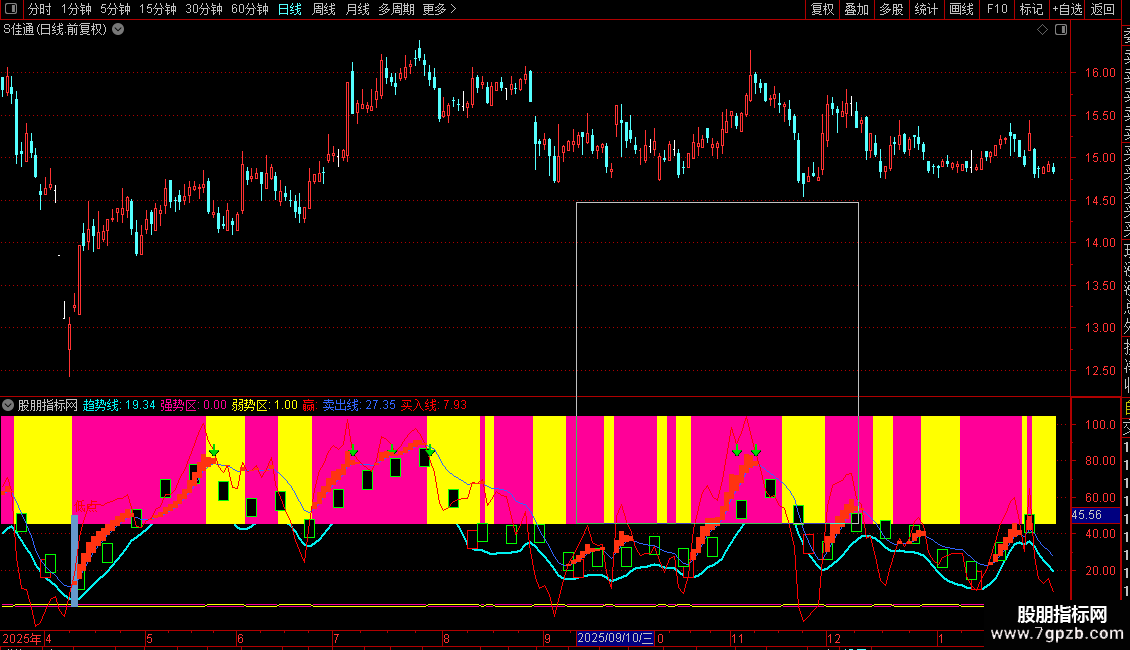 “强势区/弱势区”柱状带提供直观的多空背景。