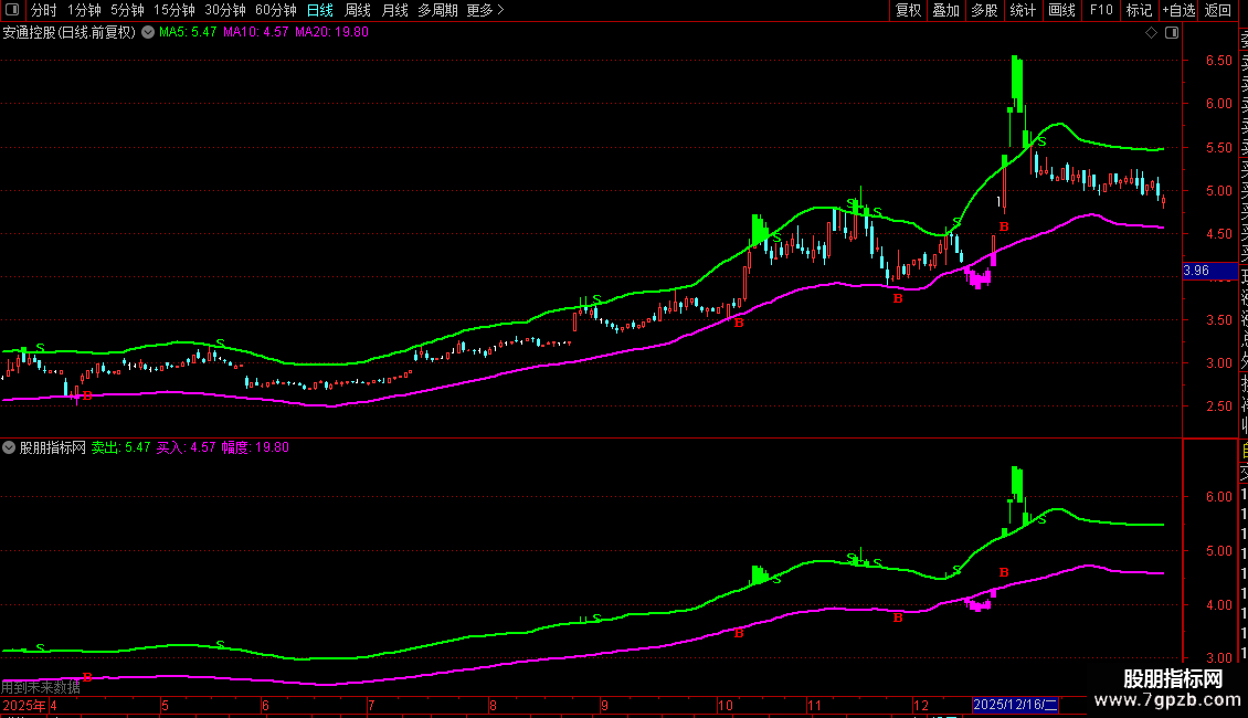 指标构建了一个由“买入线”和“卖出线”组成的通道。其核心视觉逻辑是,通过K线染色的变化,直观展示价格在通道内外的波动。当价格触及或突破下轨(买入线)时,可能产生买入信号(B);当价格触及或突破上轨(卖出线)时,可能产生卖出信号(S)。使用者可观察K线颜色变化与信号标记,结合通道宽度(幅度)来辅助判断市场状态和交易时机。