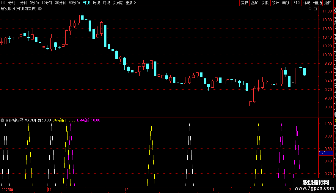 2、SAR指标,股价重新回到SRA指标以上,SAR转向到股价之下运行即为翻红;