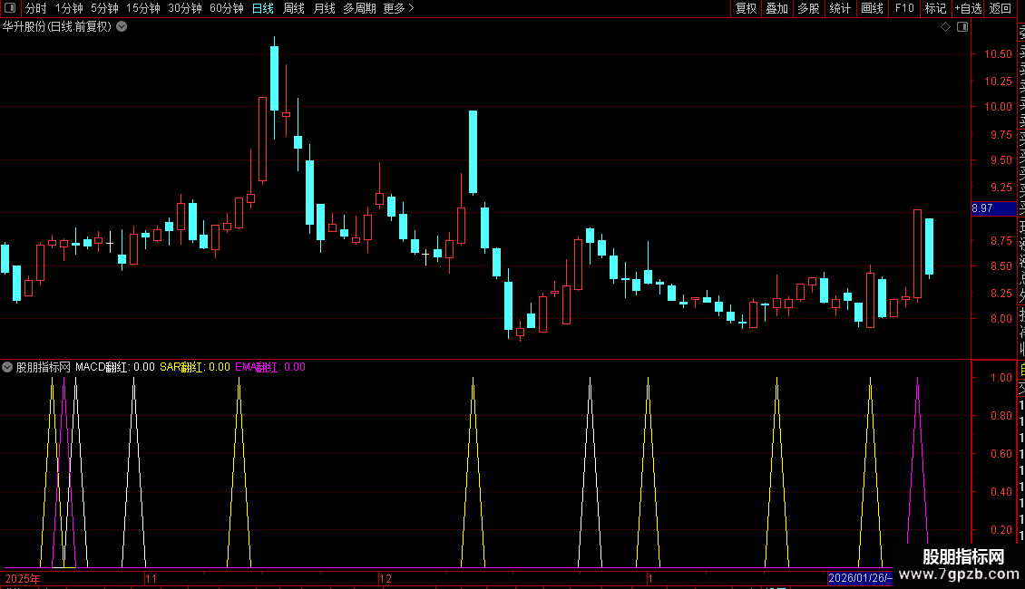 3、EXPMA指标,7号操盘线(参数7)金叉2号操盘线(参数21)即为翻红。