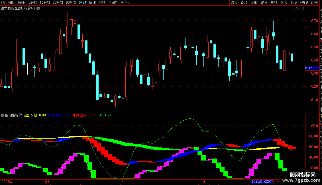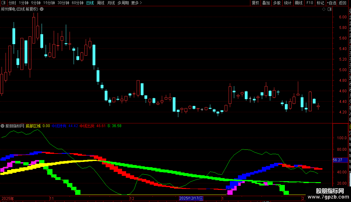 2. 趋势跟踪:以`中线持有`与`中线出货`线的相对位置及对应柱色(蓝/红)作为中期持仓的主要依据。蓝色柱区域可考虑持有或寻找机会,红色柱区域应注意控制风险。