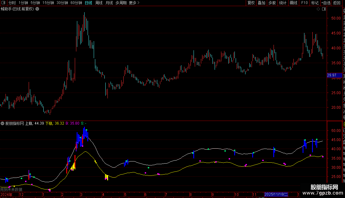 STICKLINE(LOW<下轨*0.99,LOW,下轨,1,0)COLORYELLOW;