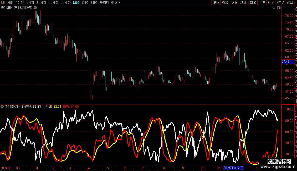 2. 主力线与散户线形成对比:主力线上穿散户线可能预示主力进场。