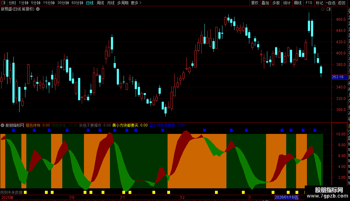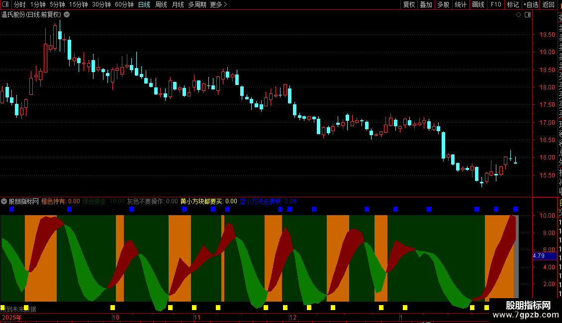 2. 等关键信号:在橙色持有区域,若出现底部黄色小方块,是加码或买入信号。在绿色快走区域或橙色区域末端,若出现顶部蓝色小方块,是必须执行的卖出信号。