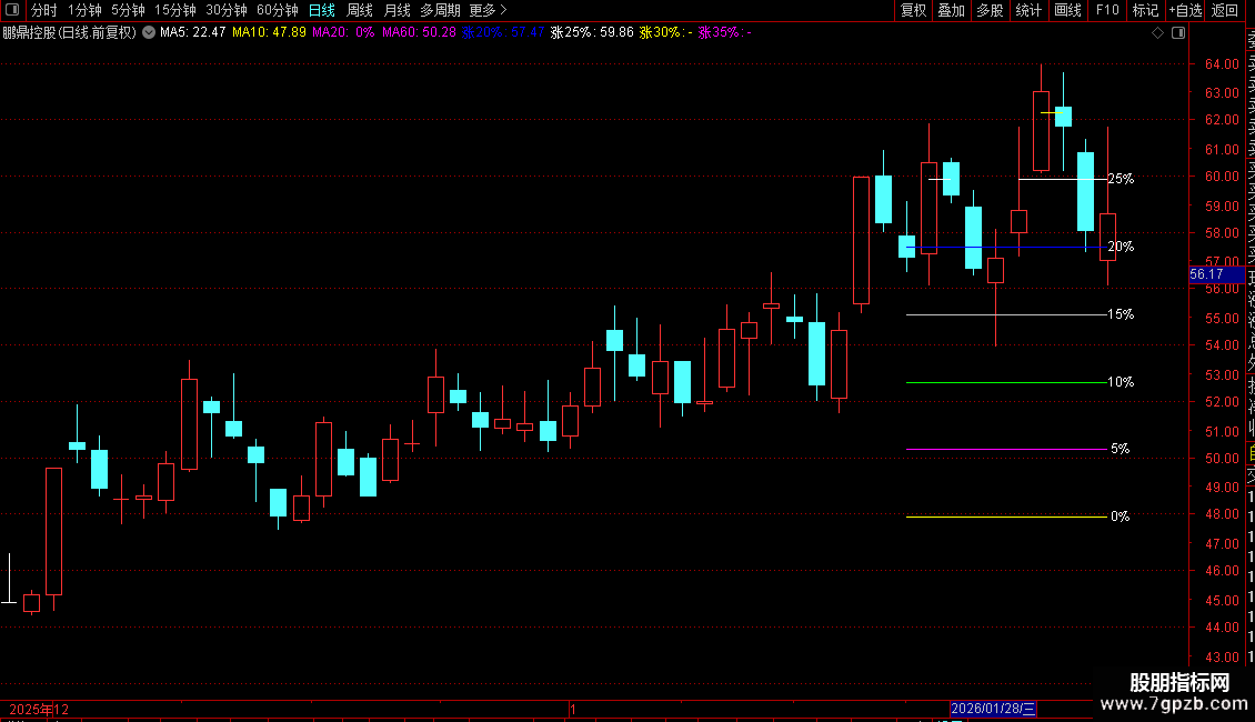 3. 根据股价波动,在达到相应涨幅位置时,绘制对应的水平线并标注涨幅百分比(如5%、10%等)。