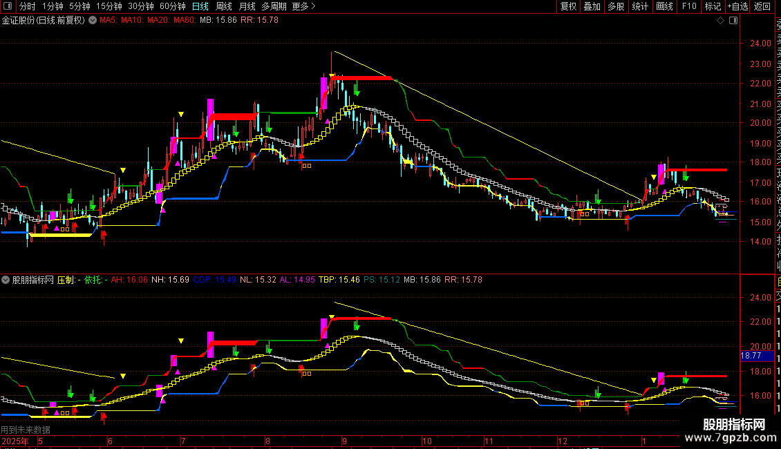 在最后一根K线位置,会根据当前收盘价相对于这些水平线的位置,显示不同粗细的色块,直观展示当前价格所处的压力或支撑区间。