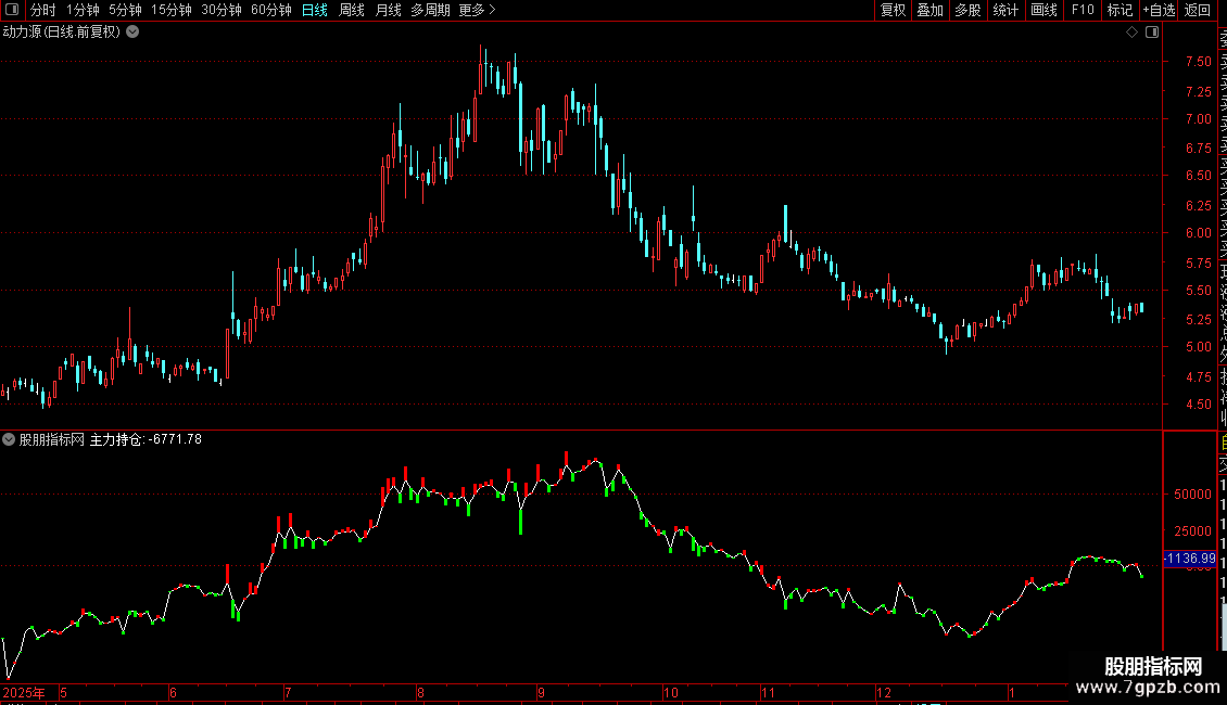 STICKLINE(DT<0,主力持仓+DT,主力持仓,1,0),COLOR00FF00;