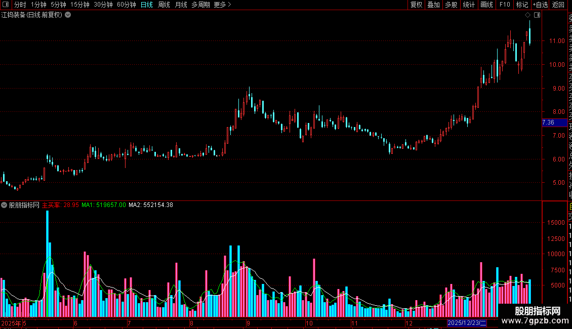主动卖盘赋值:如果收阳线,返回0-VAR1*((最高价-收盘价)+(开盘价-最低价)),否则返回如果收阴线,返回0-VAR1*(最高价-最低价),否则返回0-成交量(手)/2STICK,线宽为2
