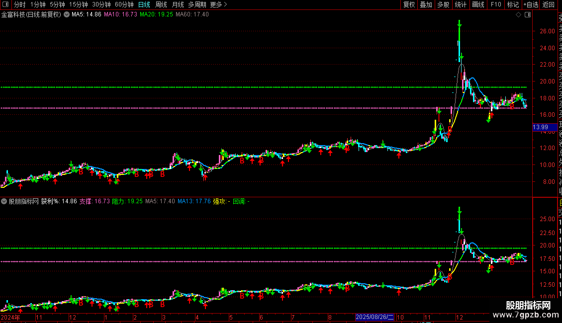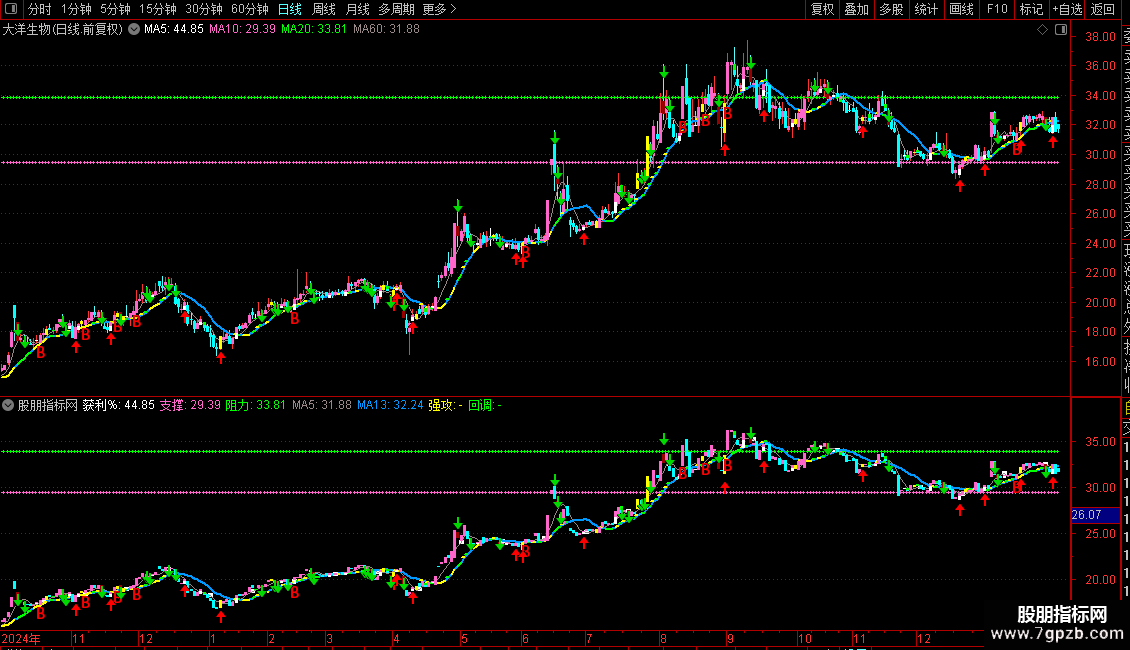 回调:IF(MA3<REF(MA3,1) AND MA3>0,MA13,DRAWNULL),COLORGREEN,LINETHICK2;