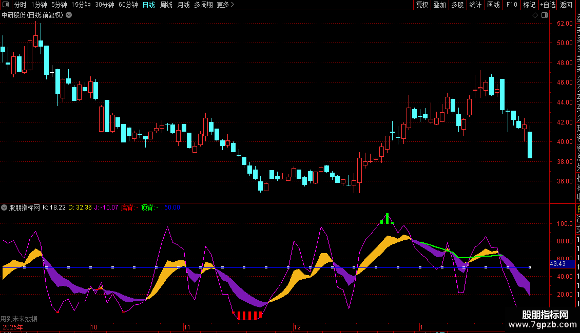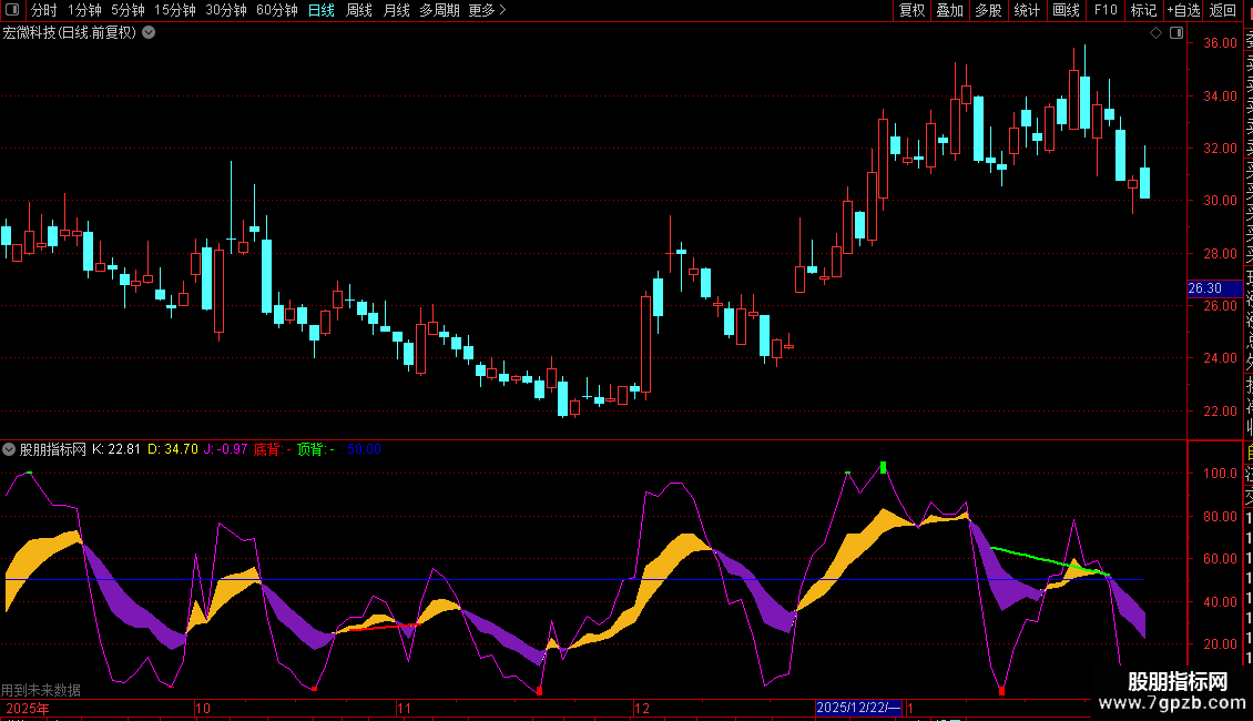 顶背离:=REF(CLOSE,A2+1)<CLOSE AND REF(K,A2+1)>K AND CROSS(D,K);