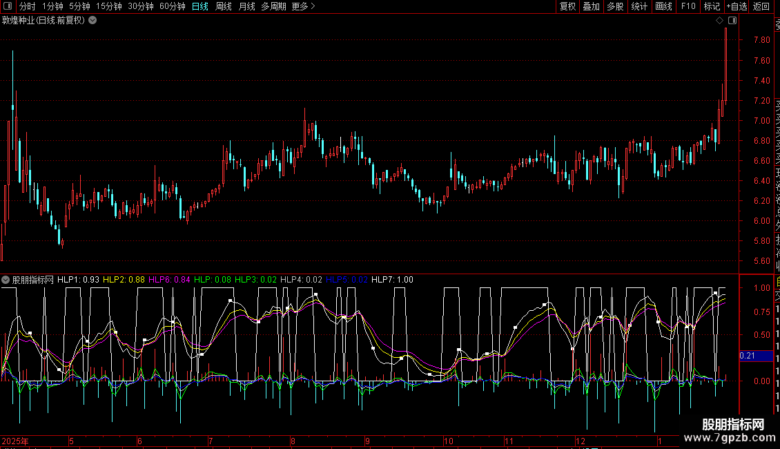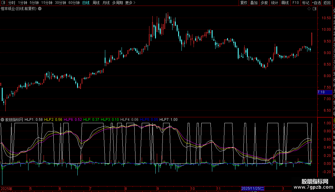 输出HLP7:HLP的1日指数移动平均的2日指数移动平均的1日指数移动平均的6日指数移动平均位于0和1之间