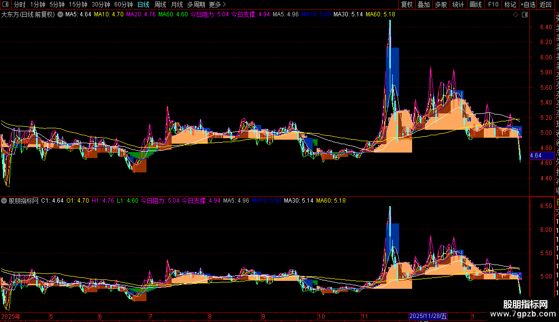 今日阻力:IF(ISLASTBAR,REF(明日阻力,1),DRAWNULL),POINTDOT,LINETHICK4,COLORMAGENTA;