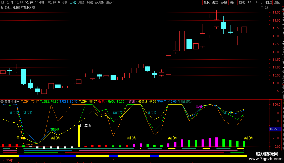TJZB2:100*(C-LLV(L,10))/(HHV(C,10)-LLV(L,10)),COLORGREEN;