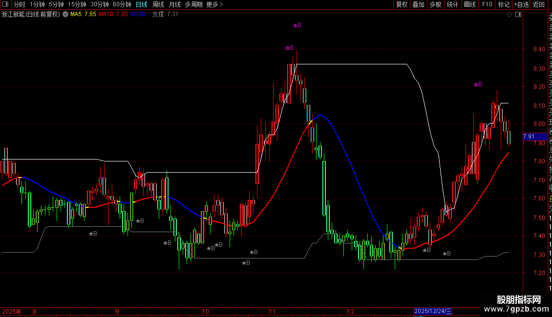 A:=AMOUNT/V/100;VARA:=EMA((((A-EMA(A,13))/EMA(A,13))*(0-100)),5);操盘线:=EMA(((VARA/10)+EMA(A,10)),3);行情线:=EMA(A,3);重心:= (C+0.618*REF(C,1)+0.382*REF(C,2)+0.236*REF(C,3)+0.146*REF(C,4))/2.382;趋势线:EMA(((SLOPE(C,22)*20)+C),55),COLORYELLOW,LINETHICK2;红升:IF(重心>=趋势线,趋势线,DRAWNULL),COLORRED,LINETHICK2;蓝降:IF(重心<趋势线,趋势线,DRAWNULL),COLORBLUE,LINETHICK2;STICKLINE(行情线<操盘线,H,L,0,1),COLORGREEN;STICKLINE(行情线<操盘线,C,O,2,1),COLORGREEN;STICKLINE(行情线>=操盘线,H,L,0,1),COLORRED; STICKLINE(行情线>=操盘线,C,O,2,1),COLORRED;压力:MA(REF(HHV(C,30),1),2),COLORWHITE;支撑:MA(REF(LLV(C,30),1),2),COLORGRAY; DA:=(EMA(C,1)+EMA(C,2)+EMA(C,3)+EMA(C,4))/4;DB:= (EMA(C,10)+EMA(C,20)+EMA(C,40)+EMA(C,80))/4;DRAWTEXT(CROSS(DA- DB,0),L*0.98,'★B'),COLORGRAY;JH:=SMA(MAX(C-REF(C,1),0),5,1)/SMA(ABS(C- REF(C,1)),5,1)*100;DRAWTEXT(CROSS(84,JH),H*1.02,'☆S'),COLORMAGENTA;涨停:=IF((C-REF(C,1))*100/REF(C,1)>=(10-0.01*100/REF(C,1)),1,0); STICKLINE(涨停,O,C,2,0),COLORRED;跌停:=IF((REF(C,1)-C)*100/REF(C,1)>= (10-0.01*100/REF(C,1)),1,0);STICKLINE(跌停,O,C,2,1),COLORGREEN;