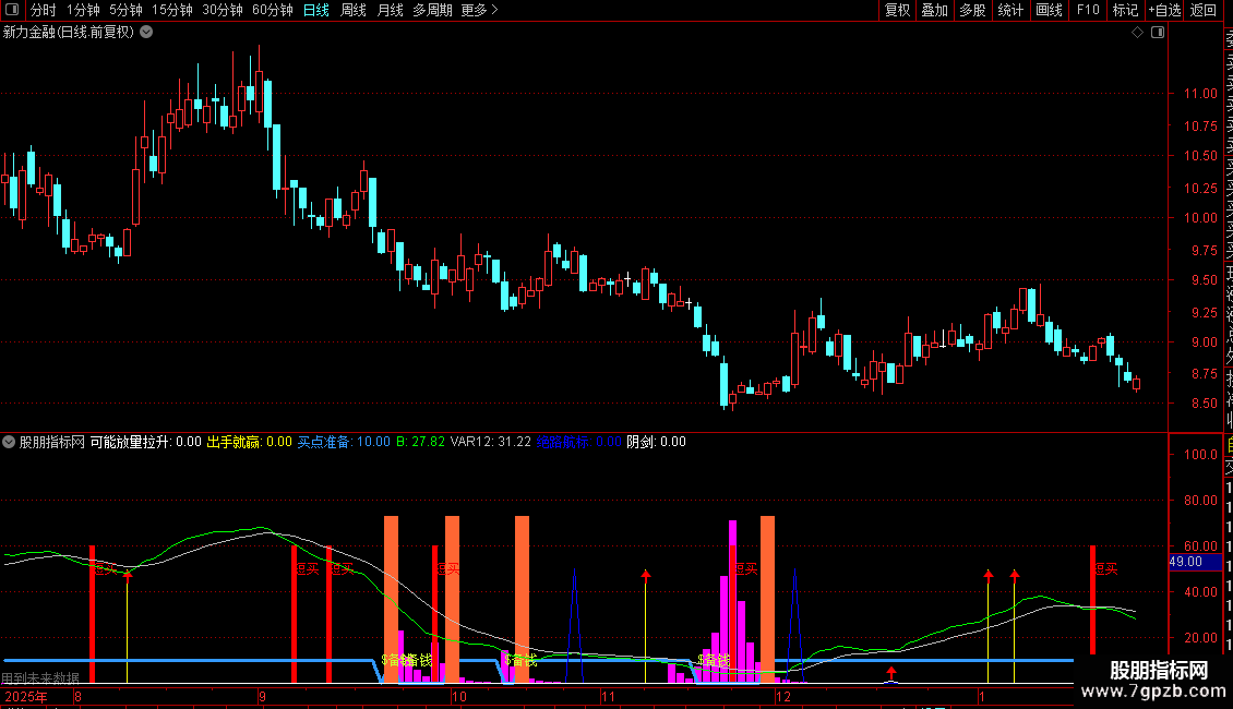 绝路航标:IF(CROSS(B,VAR12) AND B<40,50,0);