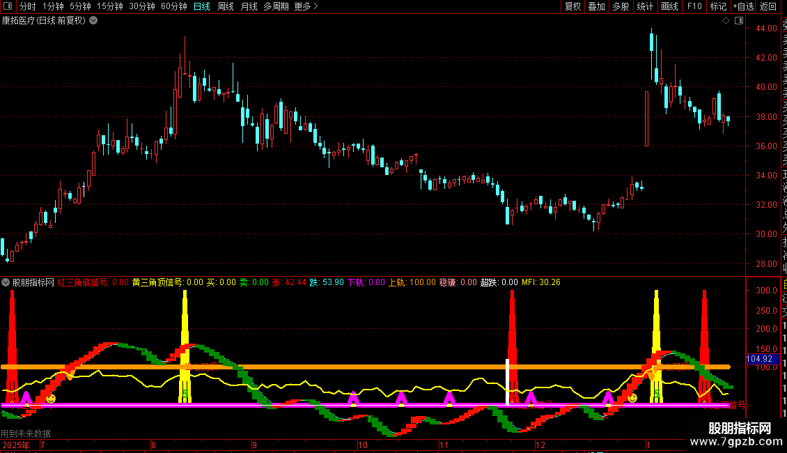 下轨:IF(CROSS(涨,跌) AND 跌<-10,30,0),LINETHICK7,COLORFF00FF,;