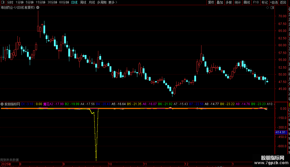 趋势:=LLV(MA(H,13),1),COLOR00FF00,LINETHICK2;