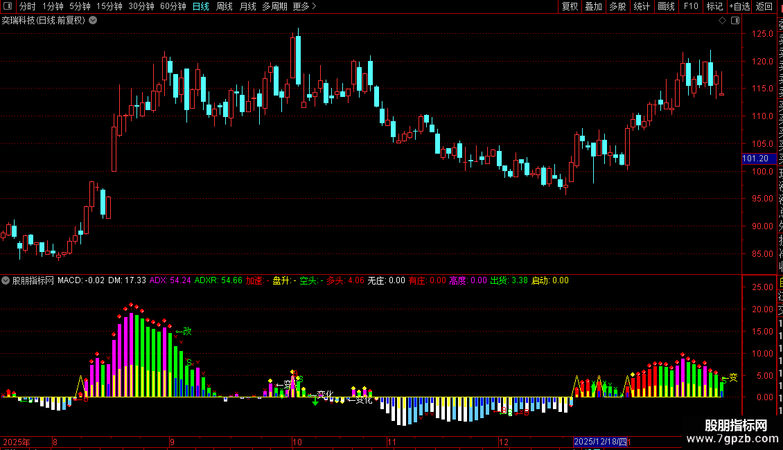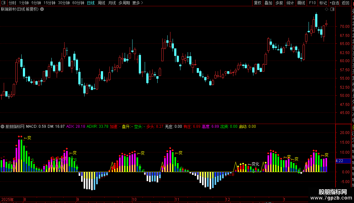 多头:IF(DM>0 AND ADXR<REF(ADXR,1),控盘*1.2,DRAWNULL),CROSSDOT,COLORRED;
