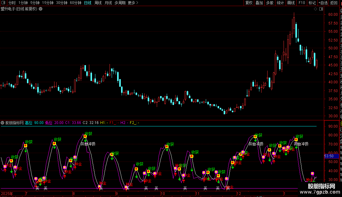DRAWTEXT(CROSS(C2,C1),REF(C1,1),'收获'),COLORGREEN;