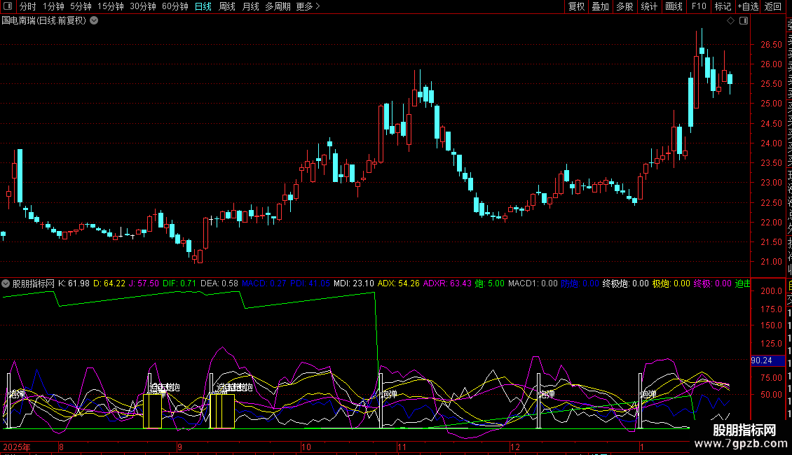 极炮: REF(K<D,1) AND K>D AND PDI>MDI AND REF( PDI > MDI,1) AND REF( PDI<MDI,2);