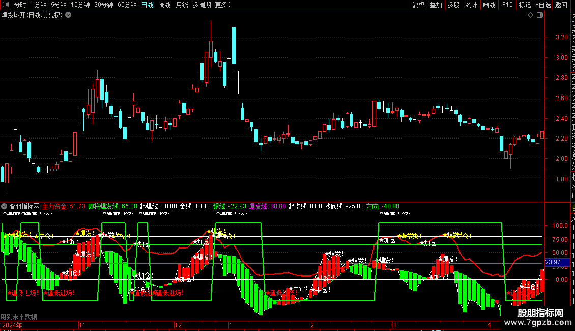 DRAWTEXT(CROSS(主力资金,即将爆发线),主力资金,'★加仓') ,COLORWHITE;