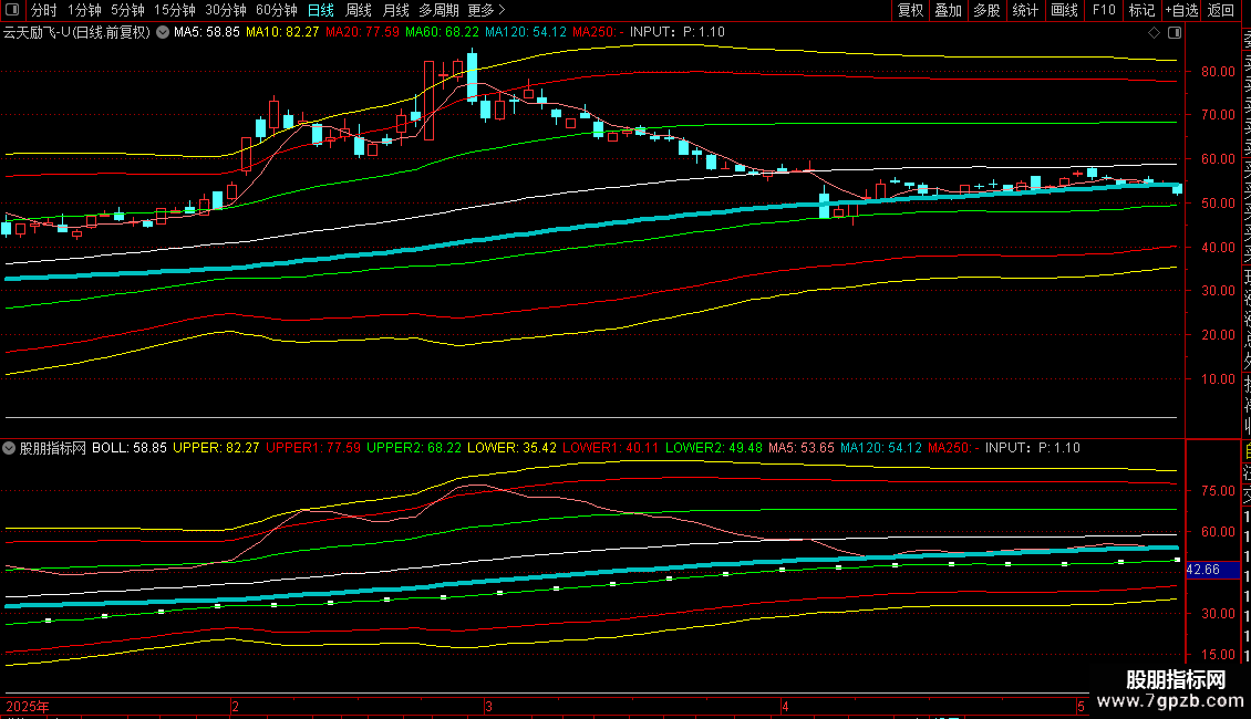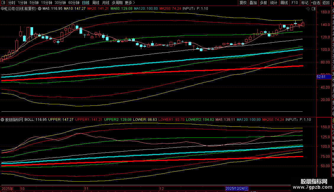 UPPER:BOLL+2.5*STD(C,P)COLORYELLOW;