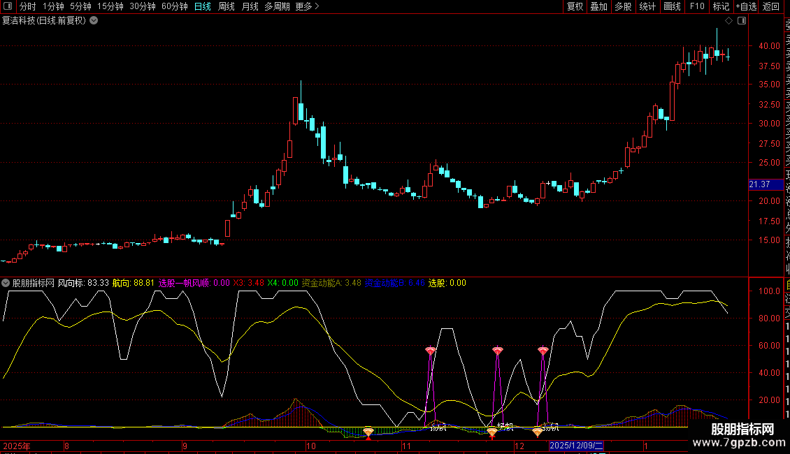 选股一帆风顺:IF(风向标<35 AND 航向<35 AND CROSS(风向标,航向),60,0);