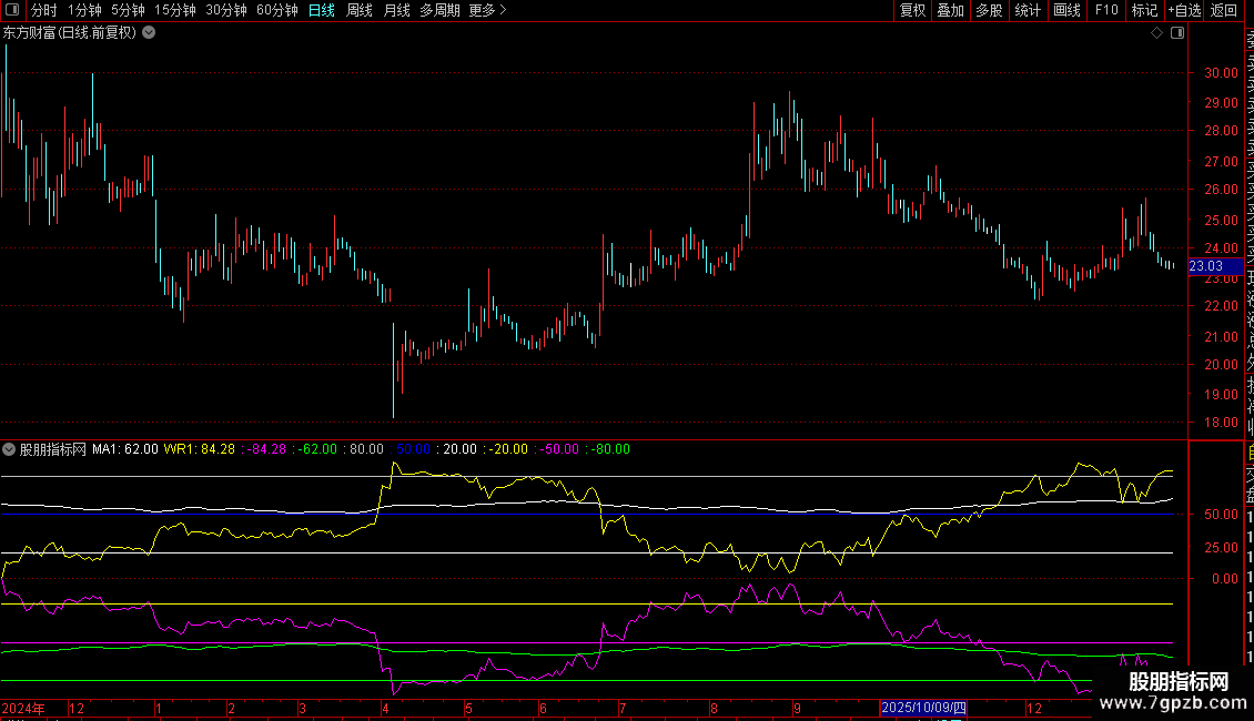 MA1:MA(WR,N),COLORWHITE;WR1:100*(HHV(HIGH,N)-CLOSE)/(HHV(HIGH,N)-LLV(LOW,N));