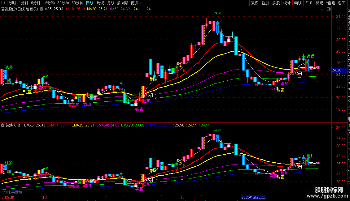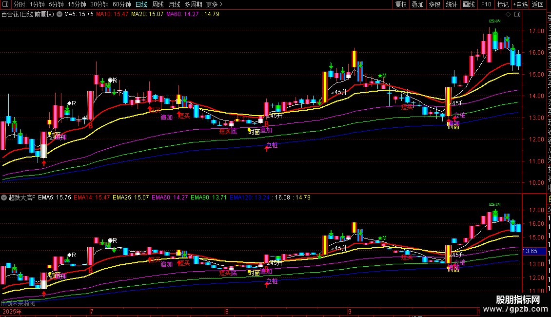 下:=EMA(中,5),COLORWHITE,LINETHICK1;