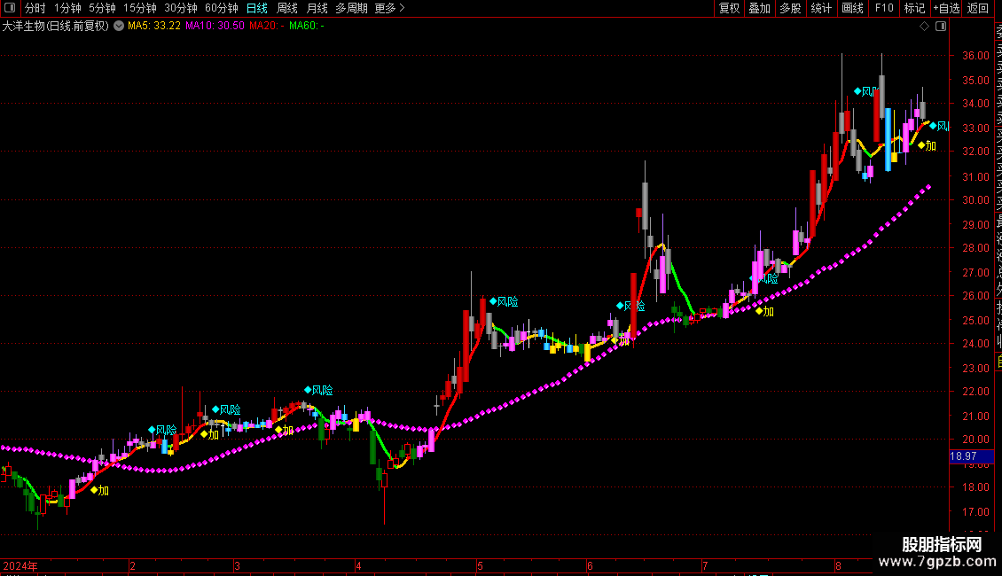 IF(BB05>30 AND MA05>REF(MA05,1), MA05,DRAWNULL),LINETHICK3,COLORRED;