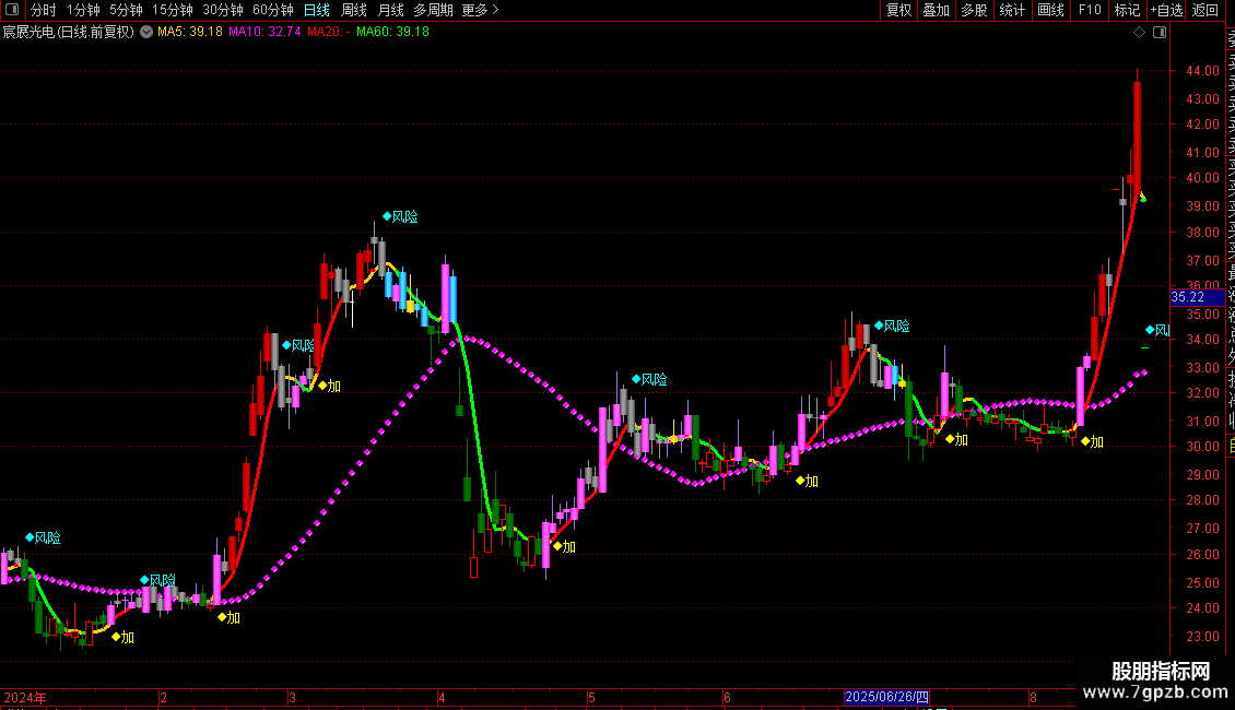 DRAWTEXT(减仓,HIGH*1.02,'◆风险'),COLORCYAN;