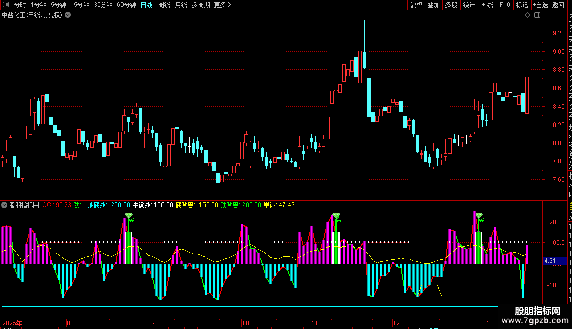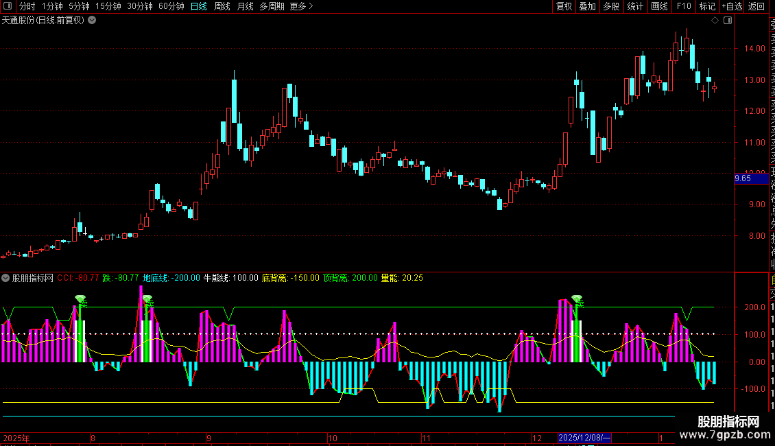 一.cci(优化版)指标 优化了底背离, 顶背离, 量能线, 转强, 转弱提示 当CCI中的CCI线下穿到 -100 线下,越低越好成功率更高。