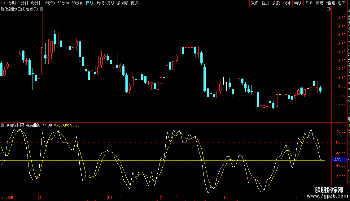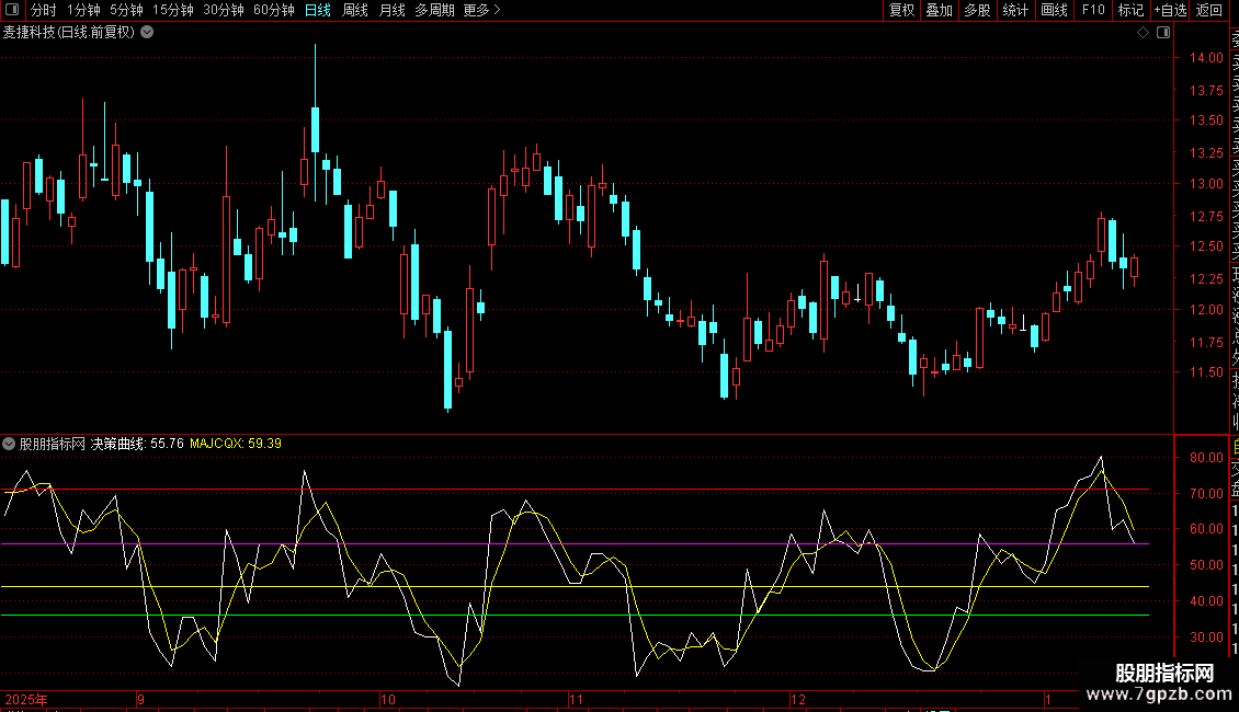 为了避免单一指标过于主观的信息,因此,融合了数十种技术指标,将其所有指标信号组合成“决策曲线”,这条“决策曲线”属于所有指标共同对当前股价波动的见解,从逻辑上说,它是一条最客观的指标曲线。