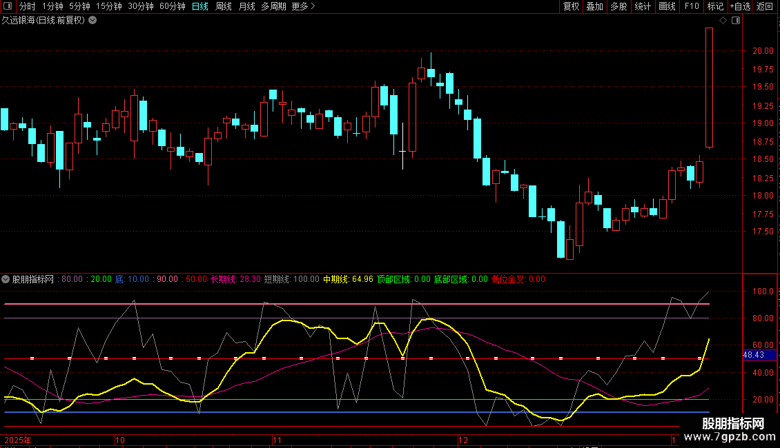 顶部区域:(中期线<REF(中期线,1) AND REF(中期线,1)>80) AND (REF(短期线,1)>95 OR REF(短期线,2)>95 ) AND 长期线>60 AND 短期线<83.5