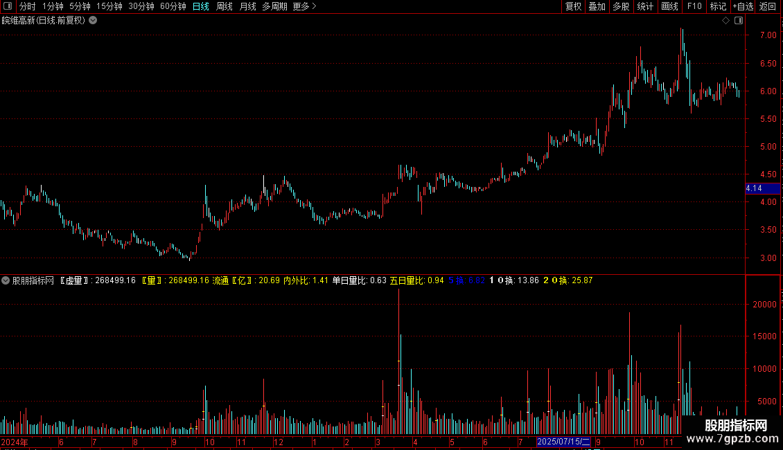 五日量比:V/(REF(MA(V,5),1)/240*FROMOPEN),COLORYELLOW,NODRAW;