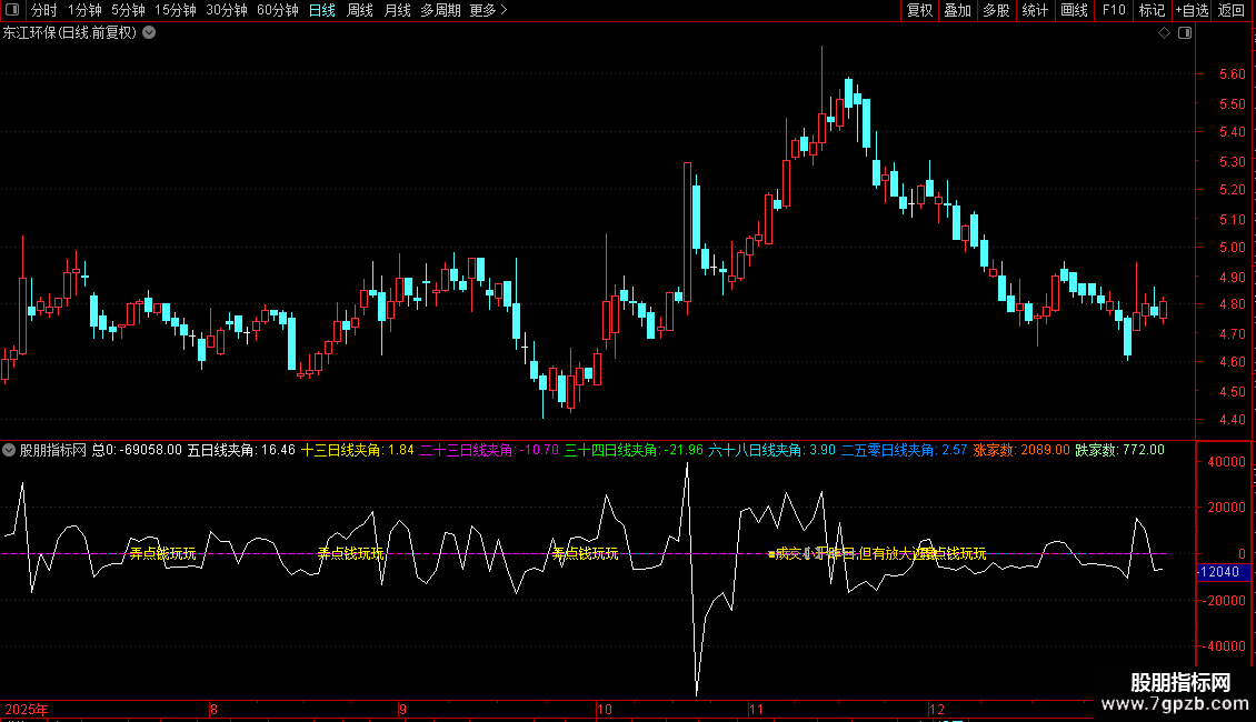 五日线夹角:ATAN((MA(C,5)/REF(MA(C,5),1)-1)*100)*57.3,COLOREEEEEE,NODRAW;
