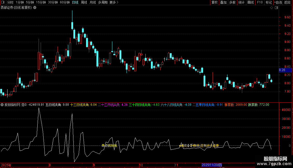 二十三日线夹角:ATAN((MA(C,23)/REF(MA(C,23),1)-1)*100)*57.3,COLOREE00EE,NODRAW;
