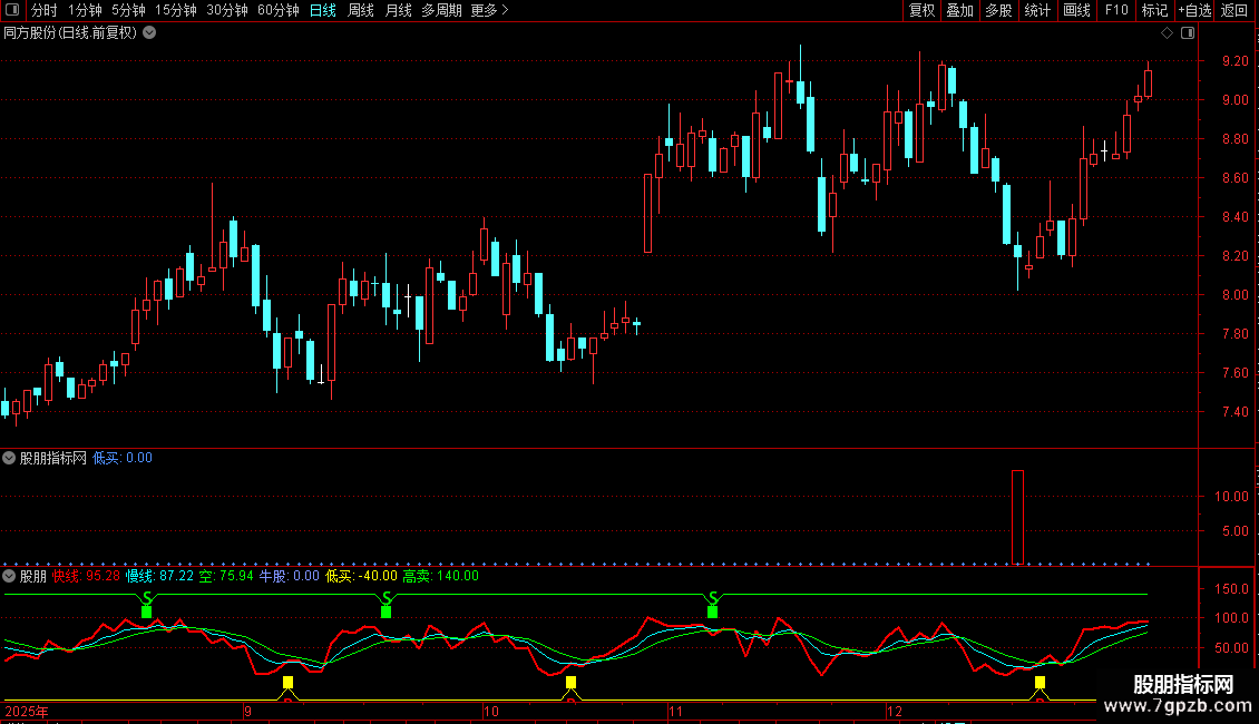 快线:(CLOSE-LLV(LOW,9))/(HHV(HIGH,9)-LLV(LOW,9))*100,LINETHICK2,COLORRED;