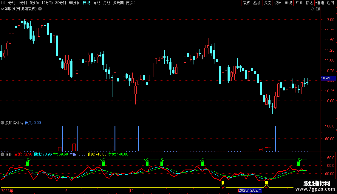 牛股:IF(BARSLAST(CROSS(慢线,空))<9 AND CROSS(慢线,空) AND 慢线<20,90,0),STICK,COLORFF937F;