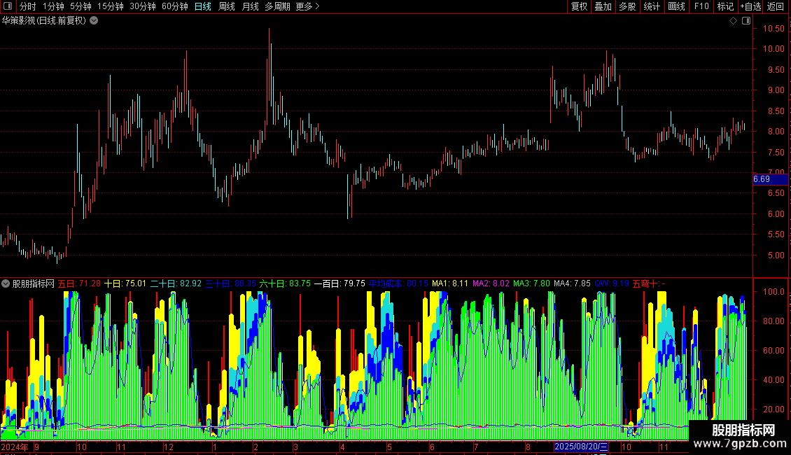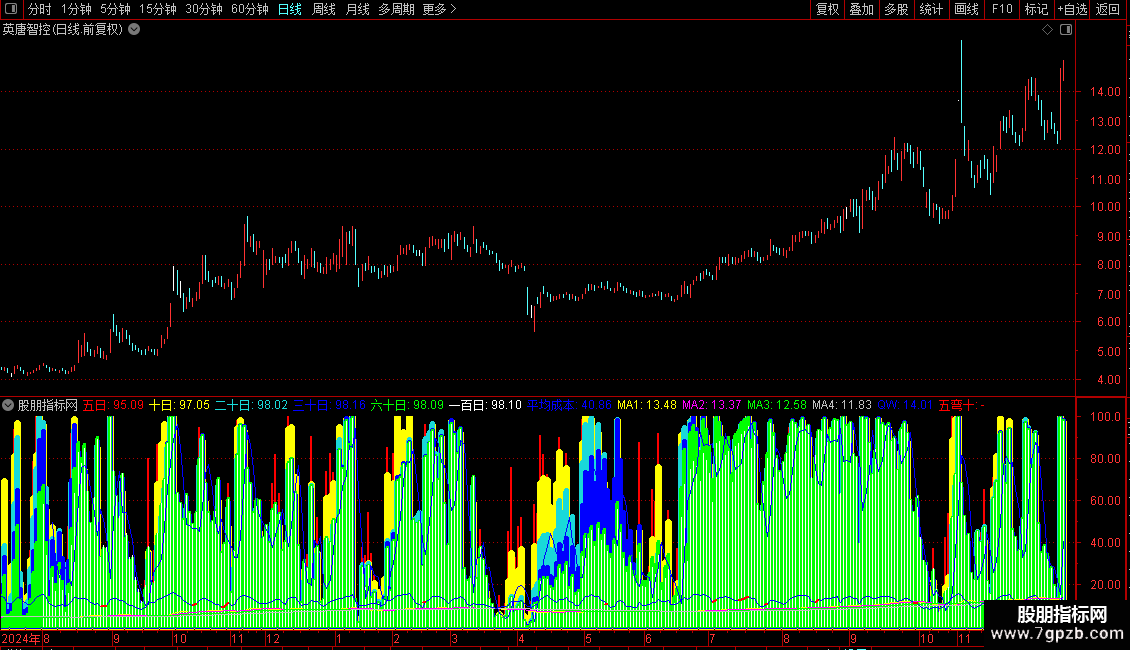 分:=CONST(LLV(指标,90)); 百:=CONST(HHV(指标,90))-分;