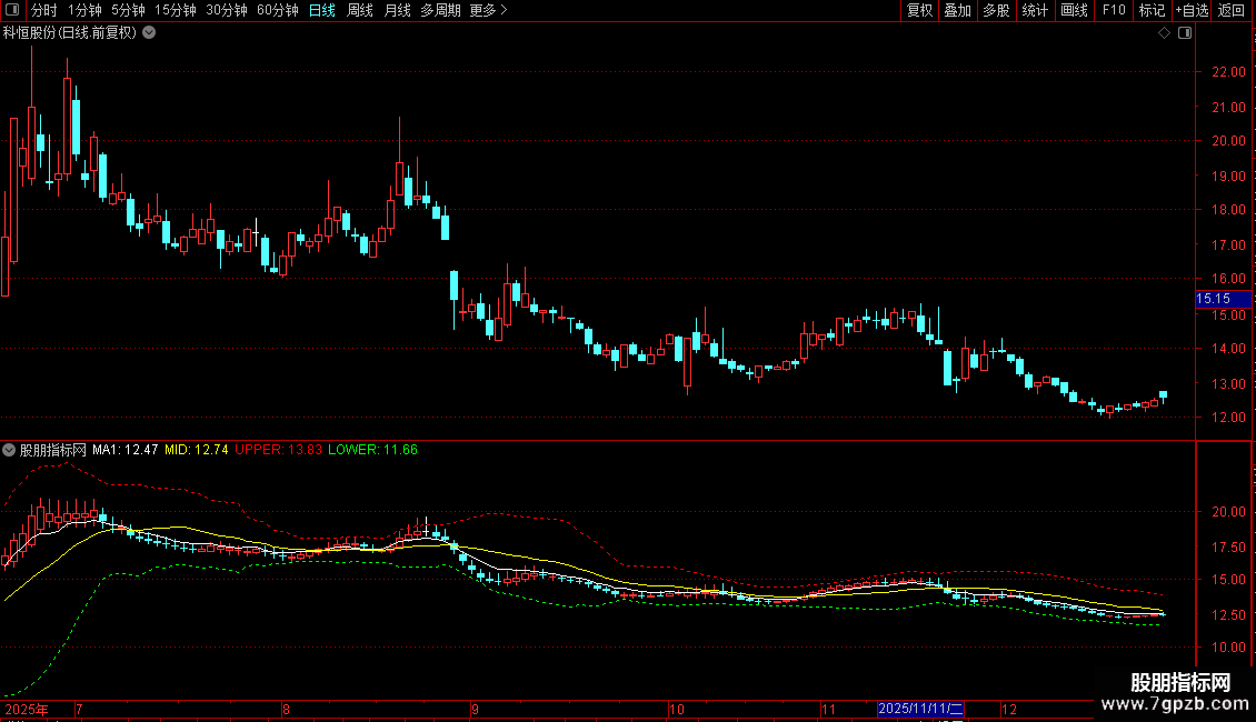 输出LOWER:MID-2*收盘价的20日估算标准差,画绿色,DOTLINE