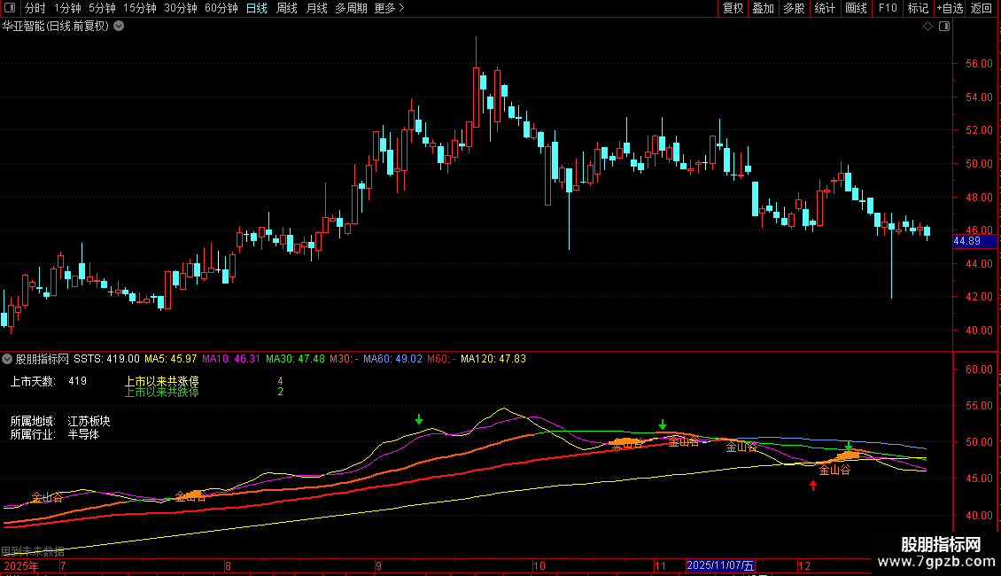 DRAWTEXT(COUNT(CROSS(MA5,MA10),21)>1 AND CROSS(MA5,MA10),L,'金山谷'),COLOR1788FF;