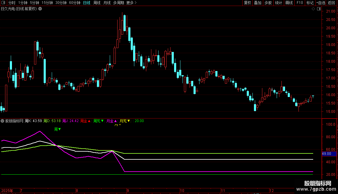 周K:MA("KDJ.K#WEEK"(N,M1,M2) ,5),LINETHICK2,COLORWHITE;