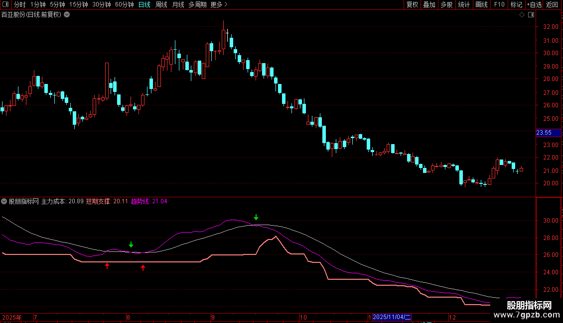 短期支撑:=LLV(HIGH,30),LINETHICK2,COLORLIRED;