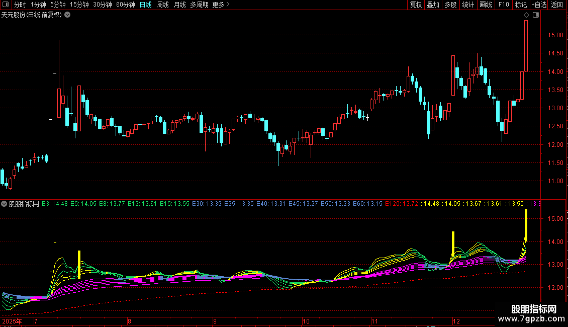 黄线3:EMA((O+C)/2,40),POINTDOT,COLOR00FFFF;