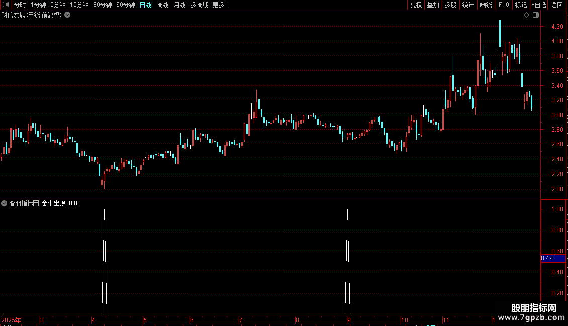 金牛出现: RR AND NOT(REF(RR,1)) AND (RR1<-100 AND BB1<-100) AND CB1<-100 AND VAR19=1;