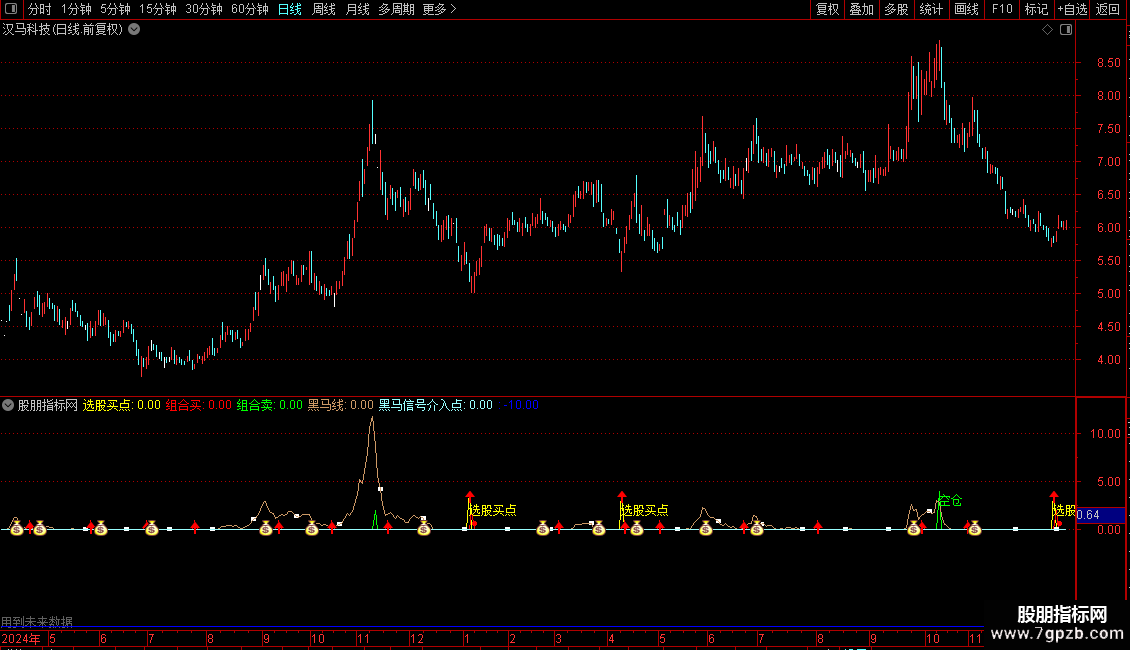 DRAWTEXT(黑马信号介入点>0,4.5,'●我的黑马介入点'), , COLORRED;
