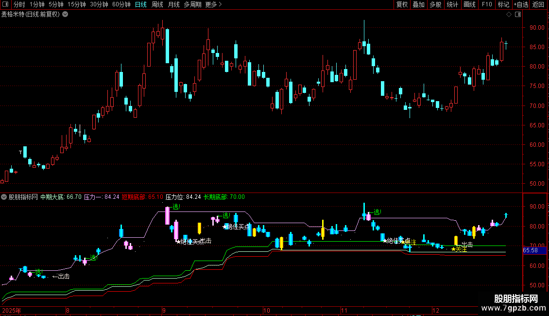 DRAWTEXT(((CROSS(MA20,压力位) AND (LOW <= MA20)) AND ((MA20 - REF(MA20,1)) > 0.02)),(LOW - 0.03),'★绝佳买点'),COLORFFF0FF;