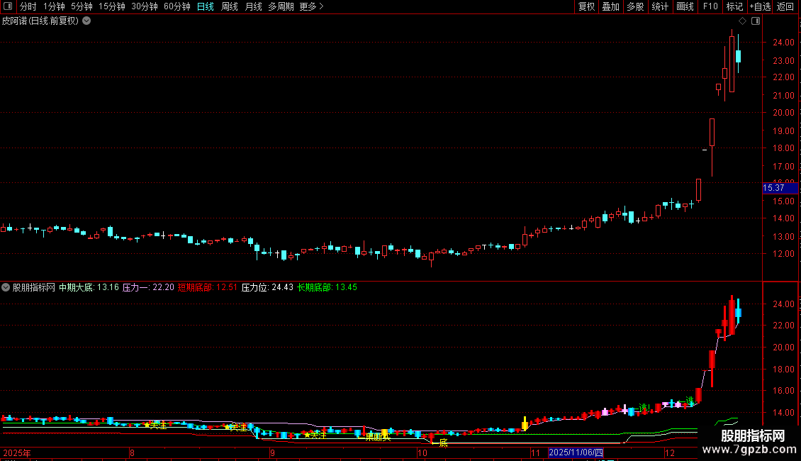 下档线:=(((CLOSE - LLV(LOW,13)) / (HHV(HIGH,13) - LLV(LOW,13))) * 100);