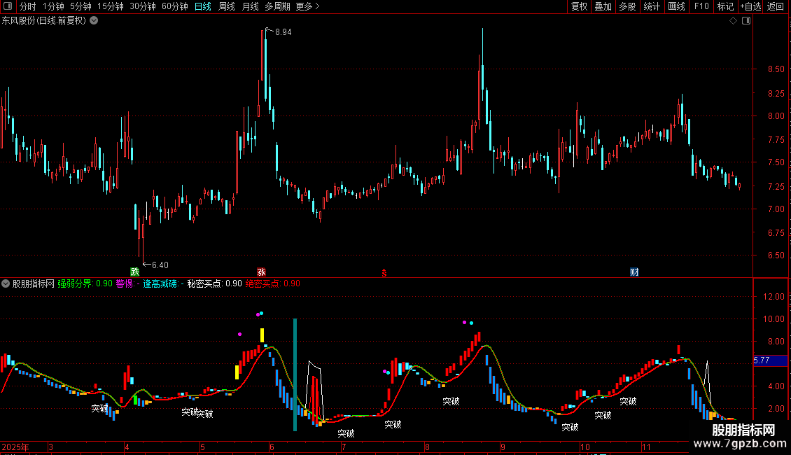 警惕:IF(CROSS(动力线1,警戒线1),量2+3,DRAWNULL),POINTDOT,LINETHICK5,COLORF00FF0;